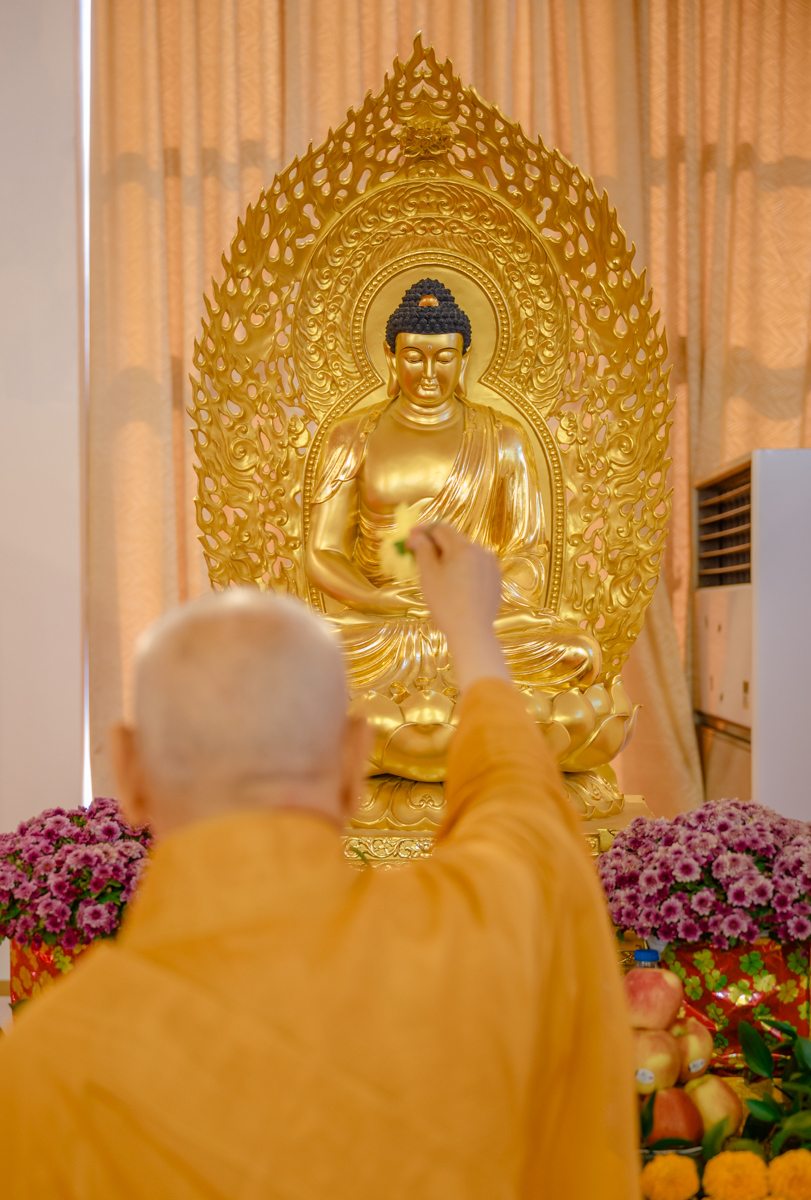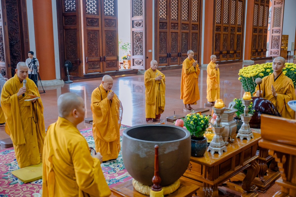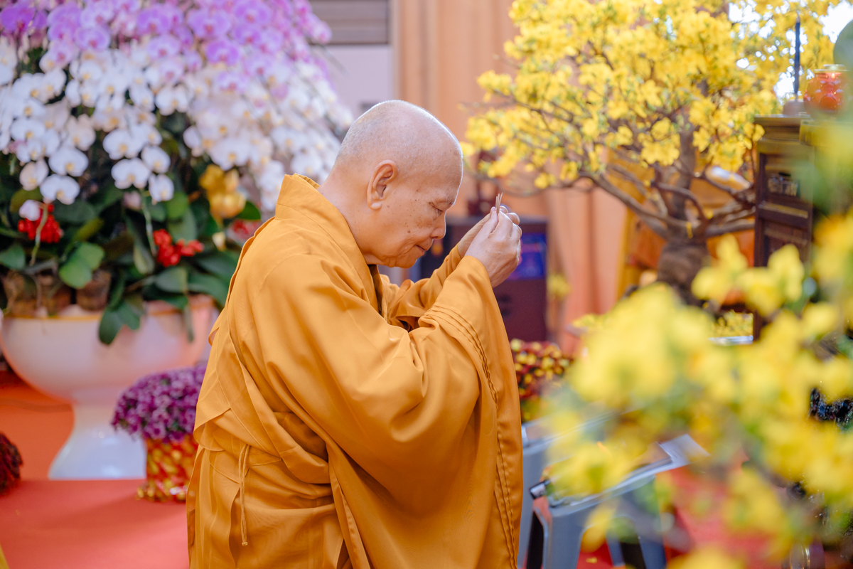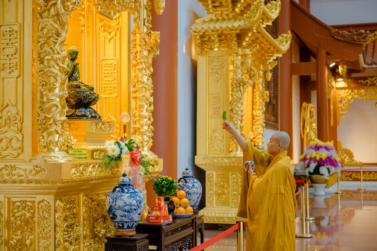 Tại chánh điện, Trưởng lão Hòa thượng Viện chủ thành kính niêm hương bạch Phật, đảnh lễ Tam bảo, sái tịnh đàn tràng và nguyện cầu cho quốc thái dân an, mưa thuận gió hòa, nhân dân an lạc, đất nước thanh bình, Phật pháp xương minh.