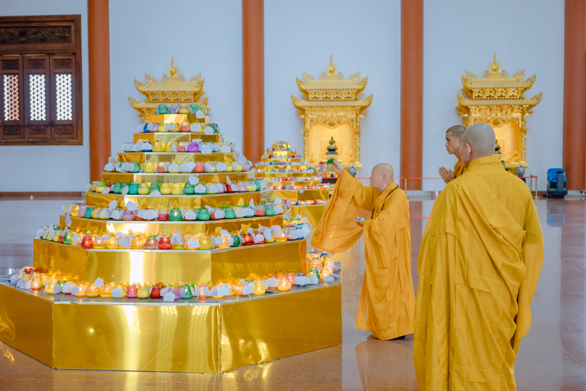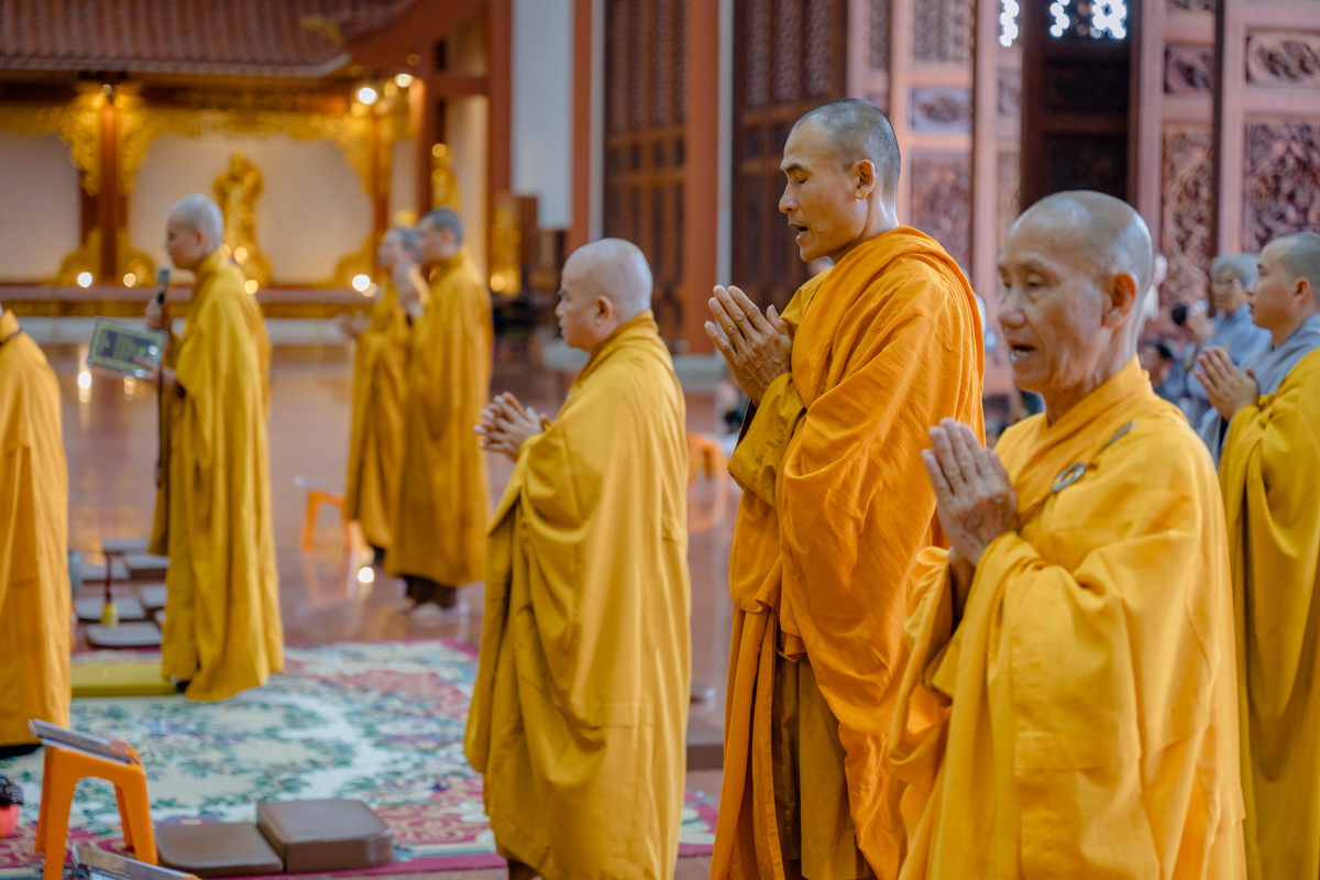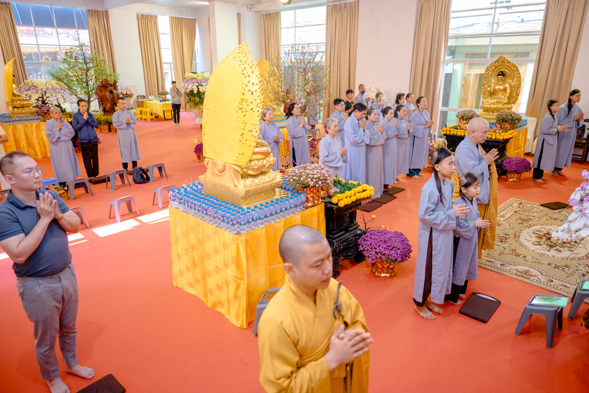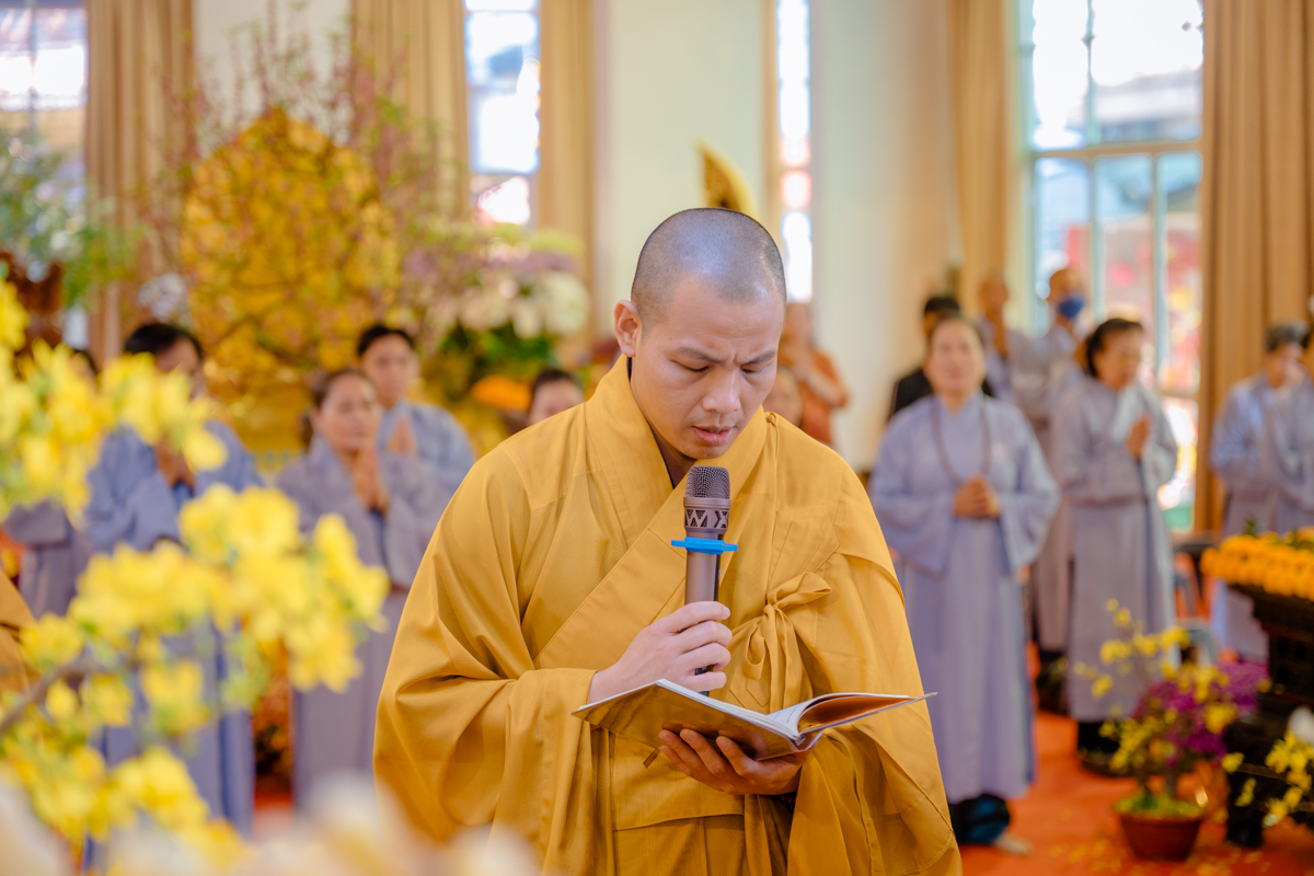 Tại chánh điện, Trưởng lão Hòa thượng Viện chủ thành kính niêm hương bạch Phật, đảnh lễ Tam bảo, sái tịnh đàn tràng và nguyện cầu cho quốc thái dân an, mưa thuận gió hòa, nhân dân an lạc, đất nước thanh bình, Phật pháp xương minh.