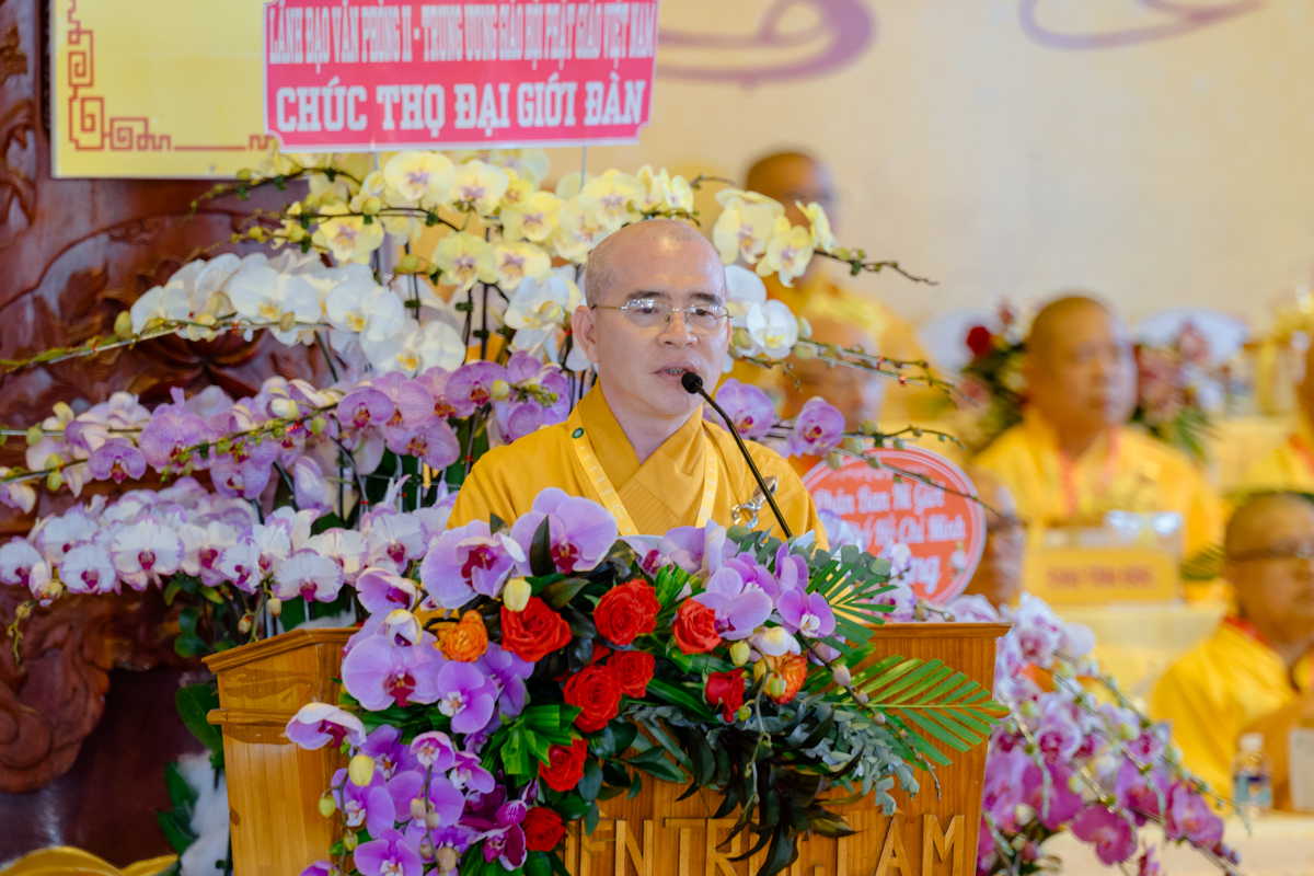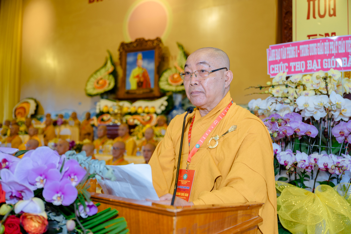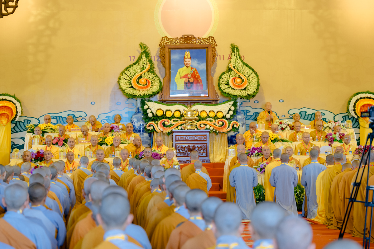 Trước khi chương trình Lễ diễn ra, toàn thể giới tử đã trang nghiêm lắng nghe lời huấn từ của Đức Pháp chủ Đại lão Hòa thượng Thích Trí Quảng gửi đến Đại Giới đàn Chơn Thành; Thượng tọa Thích Giác Dũng – Thư ký Văn phòng Đức Pháp chủ, đã cung kính tuyên đọc.