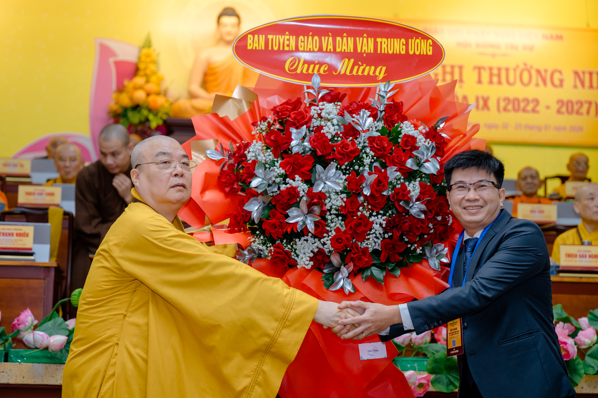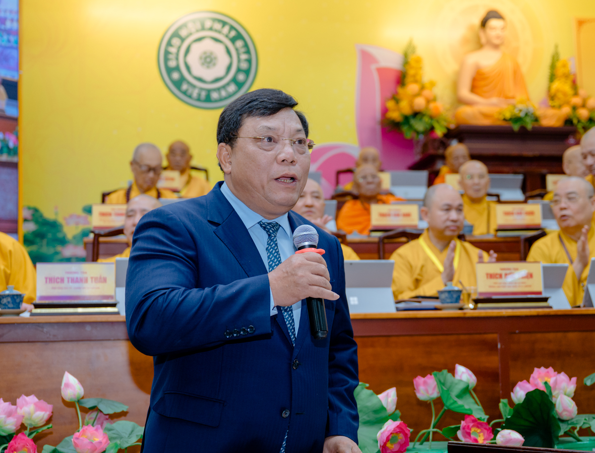 Qua đó, Thứ trưởng cũng ghi nhận và tri ân những đóng góp to lớn của Giáo hội cùng chư Tăng Ni, Phật tử cả nước trong việc góp phần ổn định xã hội, đồng hành cùng dân tộc, chung tay xây dựng đất nước ngày càng phát triển, thịnh vượng. Đồng thời cho biết, Đảng, Nhà nước và Chính phủ luôn quan tâm đến công tác tôn giáo, hết lòng đồng hành, hỗ trợ GHPGVN thực hiện tốt phương châm phụng đạo, yêu nước.