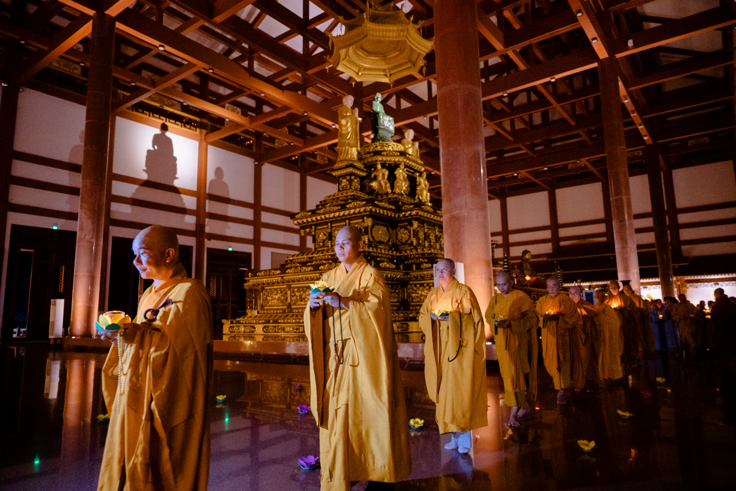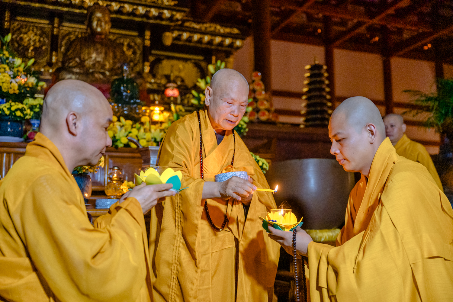 Tiếp đó, đại chúng thực hiện thiền hành quanh Chánh điện và thực hiện nghi thức dâng đăng cầu nguyện quốc thái dân an, nhân dân khắp nơi đều được bình an, mưa thuận gió hòa. Nghi lễ cũng thành kính hồi hướng năng lượng bình an đến đồng bào các vùng đang chịu ảnh hưởng của thiên tai, bão lũ, mong mọi khó khăn sớm được chuyển hóa, đời sống sớm ổn định trở lại.