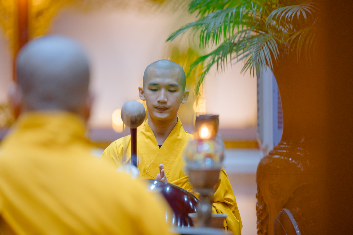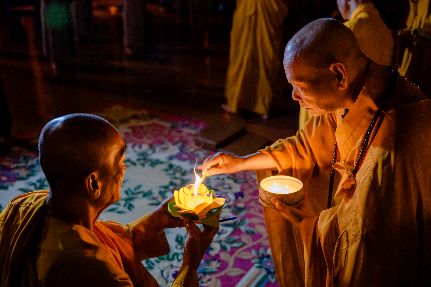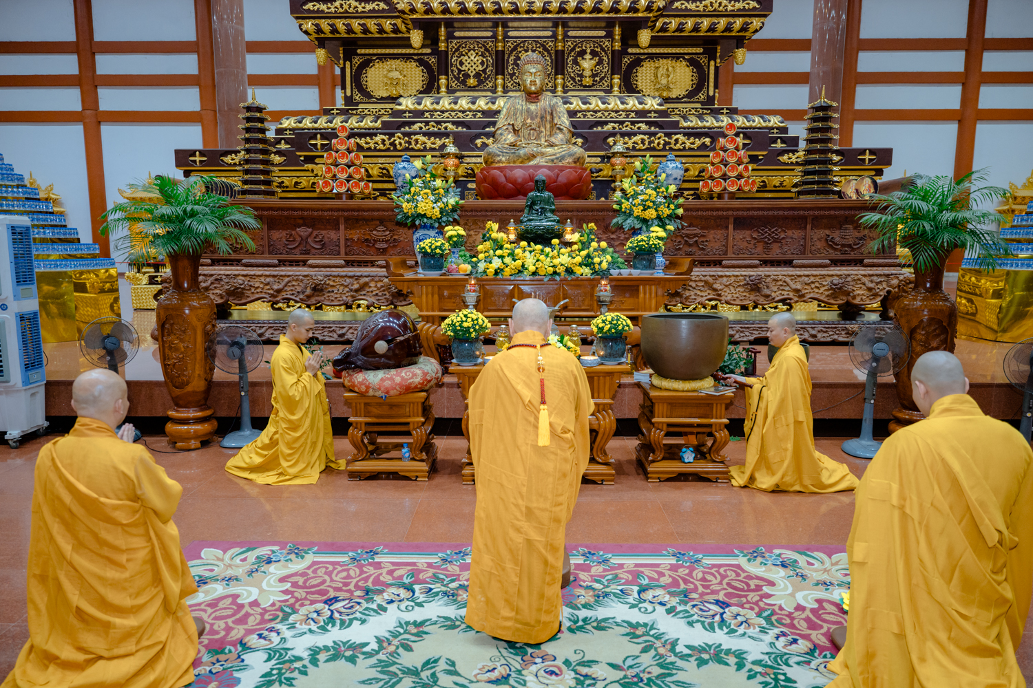 Tiếp đó, đại chúng thực hiện thiền hành quanh Chánh điện và thực hiện nghi thức dâng đăng cầu nguyện quốc thái dân an, nhân dân khắp nơi đều được bình an, mưa thuận gió hòa. Nghi lễ cũng thành kính hồi hướng năng lượng bình an đến đồng bào các vùng đang chịu ảnh hưởng của thiên tai, bão lũ, mong mọi khó khăn sớm được chuyển hóa, đời sống sớm ổn định trở lại.