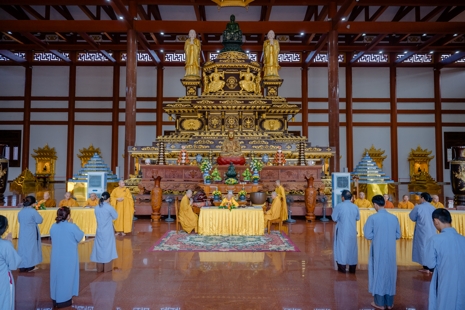 Từ sớm, Phật tử đã vân tập đông đủ, chư vị giới sư niêm hương bạch Phật, hướng đẫn đại chúng đảnh lễ Tam Bảo, sám hối, tụng kinh cầu an, và sái tịnh giới trường trước khi bước vào phần truyền trao Tam Quy – Ngũ Giới.