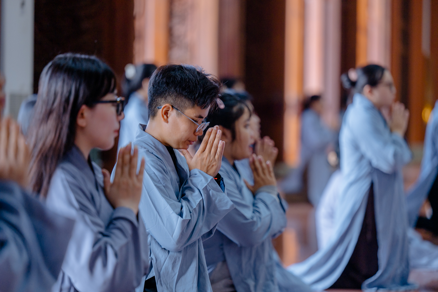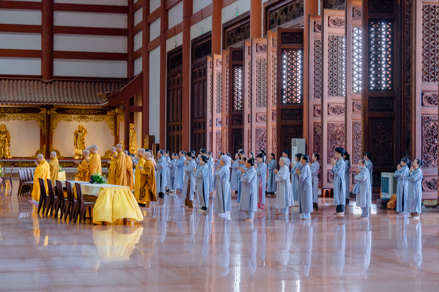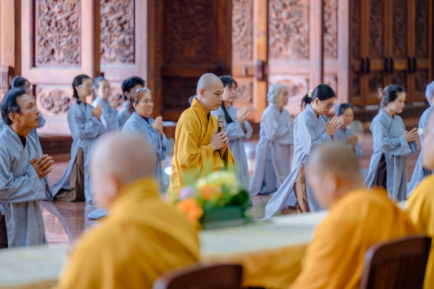 Từ sớm, Phật tử đã vân tập đông đủ, chư vị giới sư niêm hương bạch Phật, hướng đẫn đại chúng đảnh lễ Tam Bảo, sám hối, tụng kinh cầu an, và sái tịnh giới trường trước khi bước vào phần truyền trao Tam Quy – Ngũ Giới.