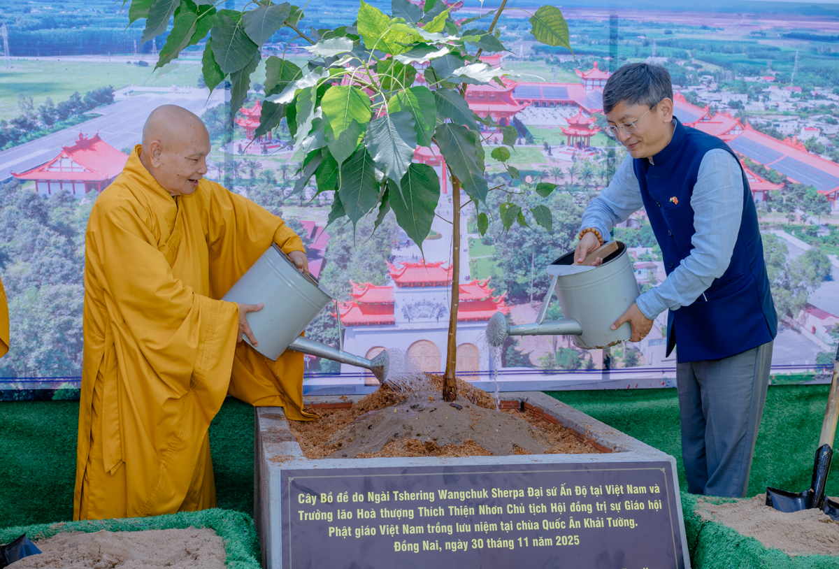 Trưa 30/11, tại chùa Quốc Ân Khải Tường, tỉnh Đồng Nai, Trưởng lão Hòa thượng Thích Thiện Nhơn – Phó Pháp chủ HĐCM, Chủ tịch Hội đồng Trị sự GHPGVN đã thân mật tiếp ngài Tshering W. Sherpa – Tân Đại sứ Đặc mệnh Toàn quyền Cộng hòa Ấn Độ tại Việt Nam đến thăm và trồng cây lưu niệm.