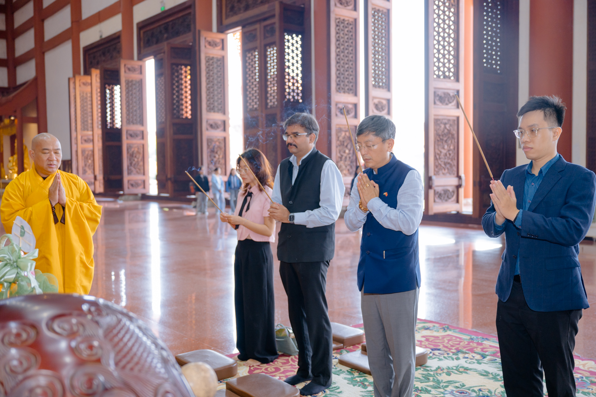 Trước đó, ngài Đại sứ cùng phái đoàn đã trang nghiêm dâng hương, đảnh lễ Tam Bảo và thực hiện nghi thức cúng dường Đức Phật tại Chánh điện. Tại đây, Thượng tọa Trụ trì đã giới thiệu khái quát về lịch sử hình thành, nét đặc trưng kiến trúc Phật giáo và vai trò của chùa Quốc Ân Khải Tường trong đời sống văn hóa – tâm linh tại địa phương.