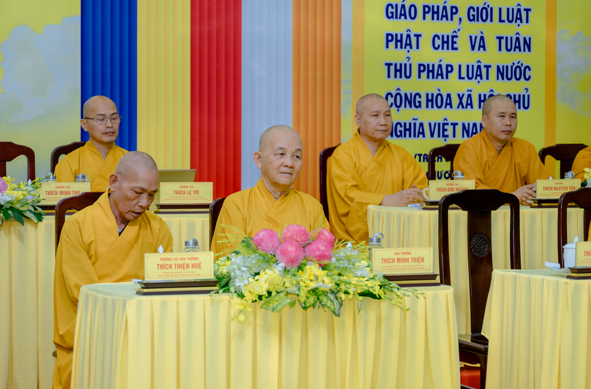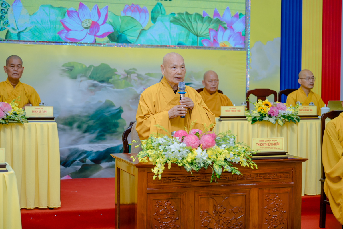 Trưởng lão Hòa thượng Thích Thiện Nhơn – Phó Pháp chủ Hội đồng Chứng minh, Chủ tịch Hội đồng Trị sự đang quang lâm chứng minh, định hướng cho khóa tập huấn và sách tấn đến Tăng Ni tham dự.