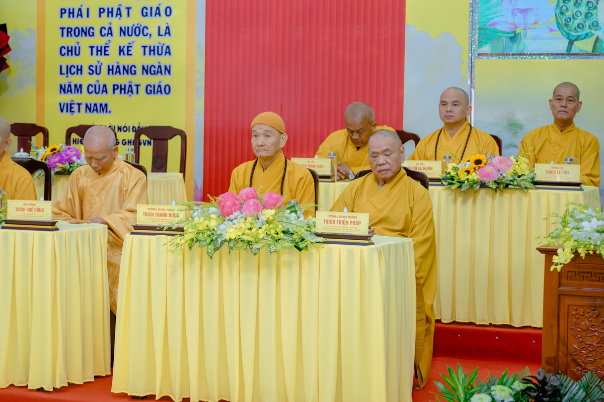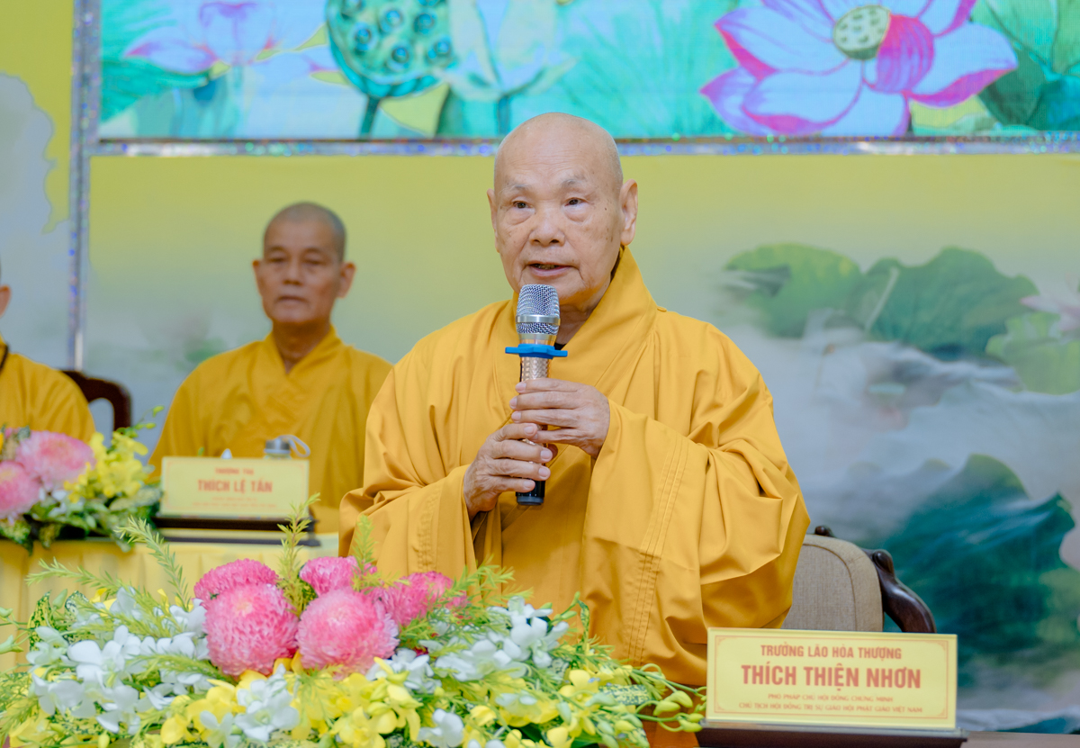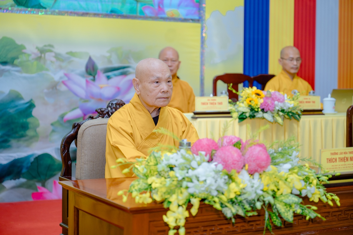 Trưởng lão Hòa thượng Thích Thiện Nhơn – Phó Pháp chủ Hội đồng Chứng minh, Chủ tịch Hội đồng Trị sự đang quang lâm chứng minh, định hướng cho khóa tập huấn và sách tấn đến Tăng Ni tham dự.