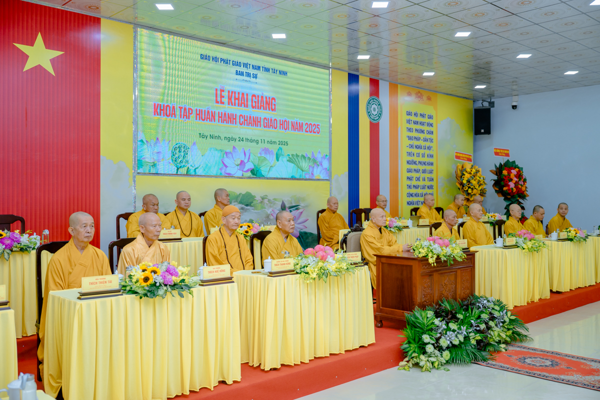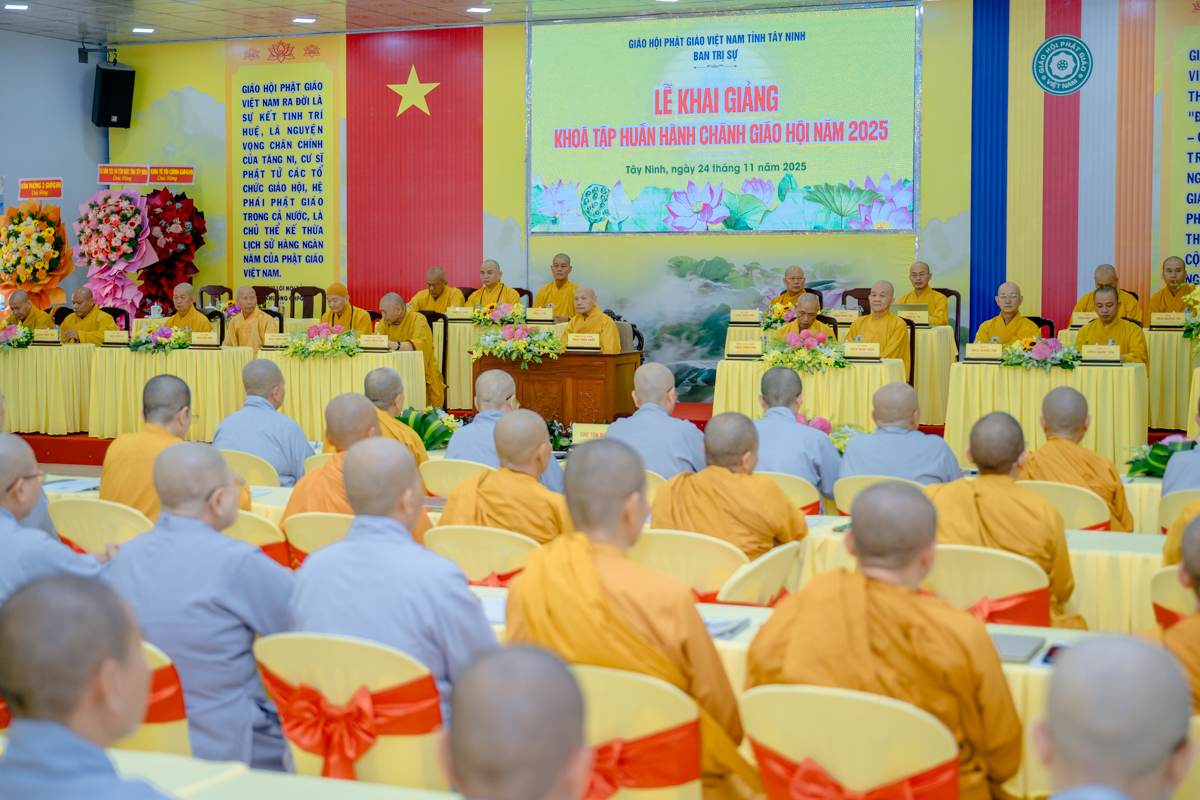 Sáng 24/11, tại chùa Pháp Minh – Văn phòng Ban Trị sự GHPGVN tỉnh Tây Ninh, Ban Trị sự tỉnh đã khai mạc Khóa tập huấn hành chánh Giáo hội năm 2025. Khóa học kéo dài trong 3 ngày, dành cho thành viên Ban Trị sự vừa kiện toàn sau sáp nhập và chư Tăng Ni trụ trì các tự viện, với mục tiêu nâng cao kiến thức hành chánh, kỹ năng quản trị và điều hành Phật sự trong bối cảnh hội nhập và chuyển đổi số.
