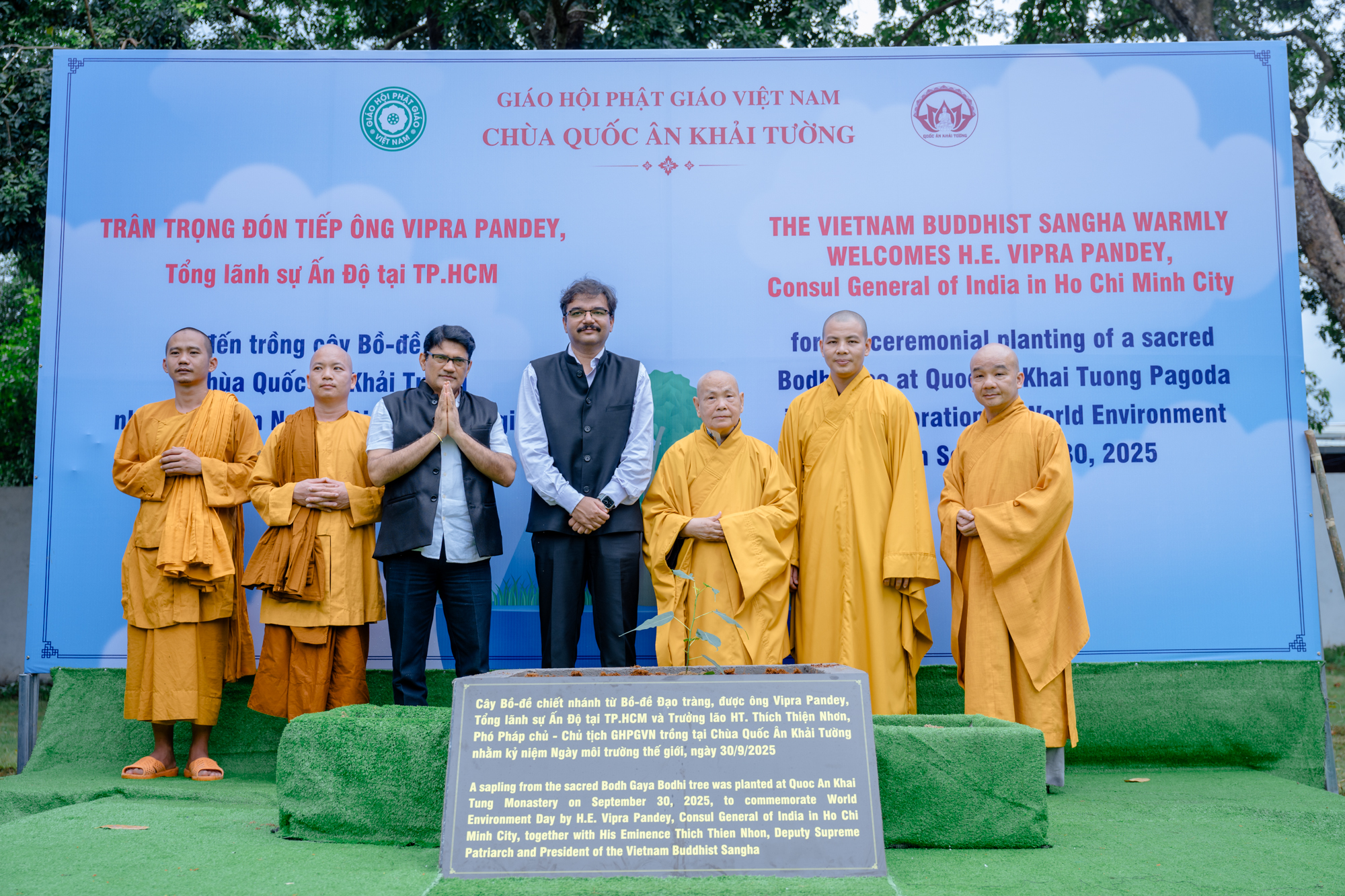 Chiều 30/9/2025, tại chùa Quốc Ân Khải Tường (Đồng Nai), Giáo hội Phật giáo Việt Nam phối hợp cùng Tổng Lãnh sự quán Ấn Độ tại TP.HCM trang trọng tổ chức Lễ trồng cây Bồ-đề, hưởng ứng Ngày Môi trường Thế giới với thông điệp “Ek Ped Maa Ke Naam – Một cái cây cho Mẹ Trái Đất”, do Thủ tướng Ấn Độ Narendra Modi khởi xướng.