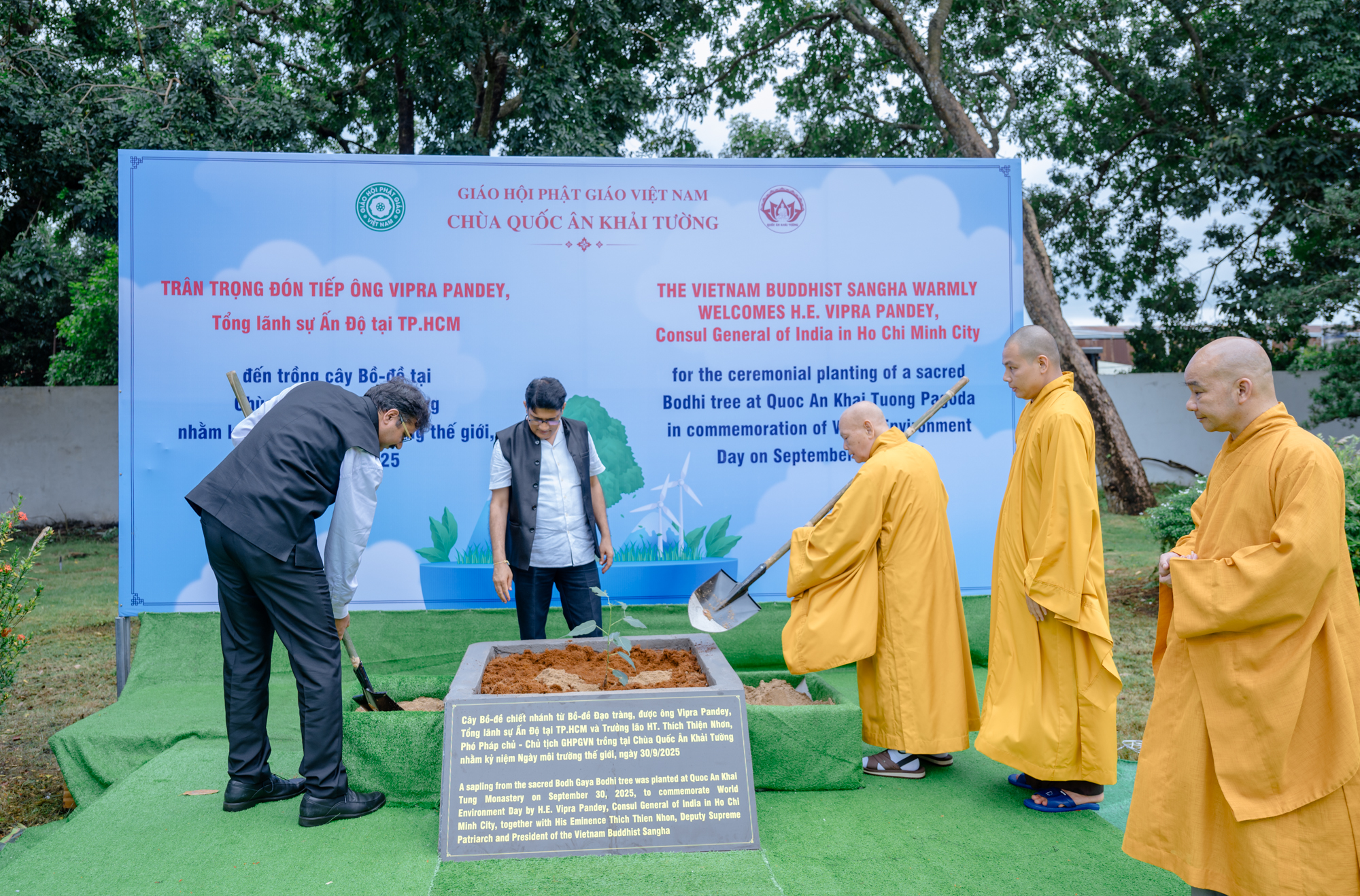 Chiều 30/9/2025, tại chùa Quốc Ân Khải Tường (Đồng Nai), Giáo hội Phật giáo Việt Nam phối hợp cùng Tổng Lãnh sự quán Ấn Độ tại TP.HCM trang trọng tổ chức Lễ trồng cây Bồ-đề, hưởng ứng Ngày Môi trường Thế giới với thông điệp “Ek Ped Maa Ke Naam – Một cái cây cho Mẹ Trái Đất”, do Thủ tướng Ấn Độ Narendra Modi khởi xướng.