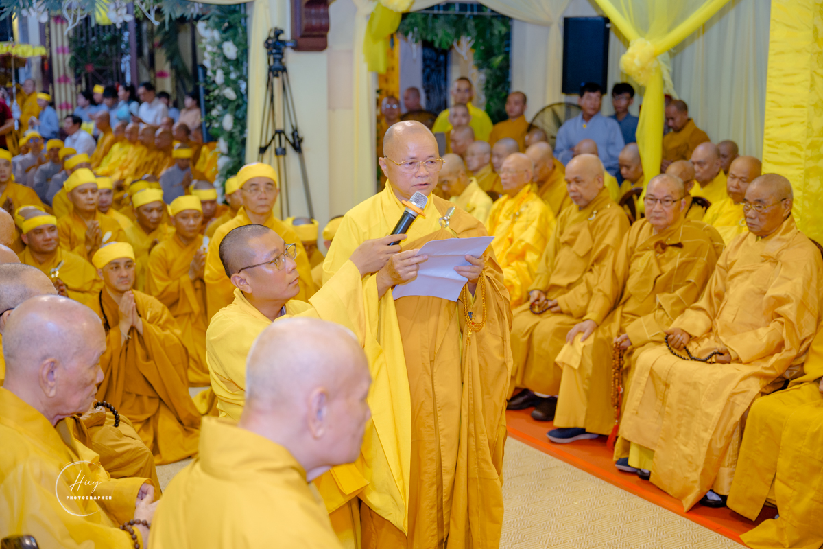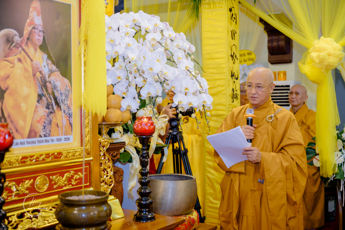 Tiếp đó, Hòa thượng Thích Nhật Hỷ – Phó Trưởng ban Thường trực Ban Trị sự Phật giáo TP.HCM thay mặt Ban Tổ chức Tang lễ dâng lời cảm tạ chư tôn đức giáo phẩm, Tăng Ni và Phật tử đã quang lâm dâng hương tưởng niệm và hộ niệm, trợ duyên để tang lễ được cử hành trang nghiêm, viên mãn.