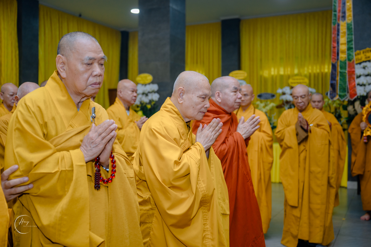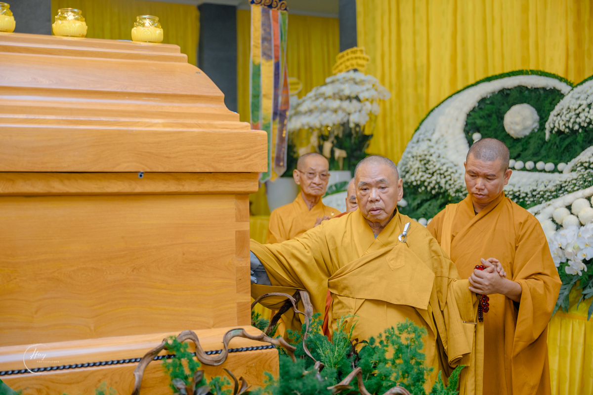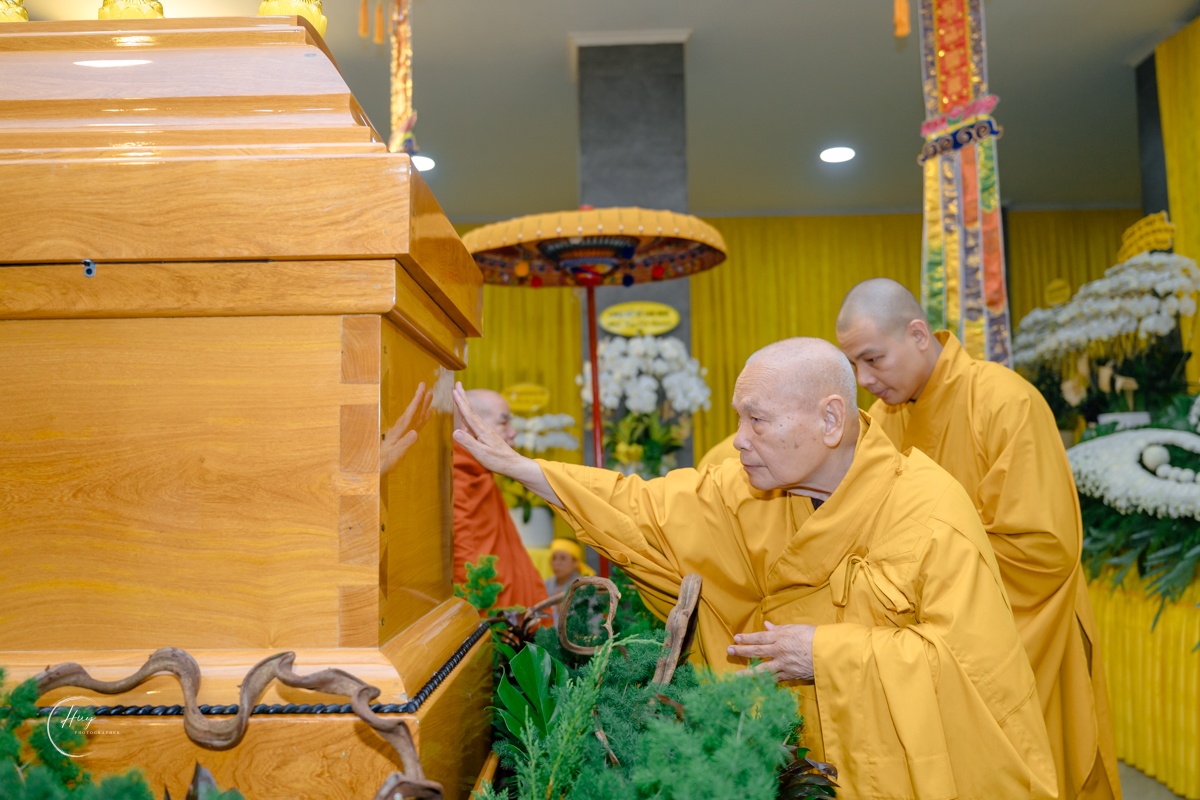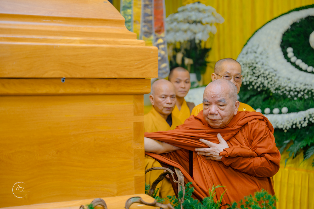 Trong giây phút trang nghiêm và vô vàn kính tiếc, chư Tôn đức lần lượt hữu nhiễu kim quan, tiễn biệt vị pháp hữu đồng hành, người đã cùng chư vị trưởng lão xây dựng và phát triển Giáo hội từ những ngày đầu thành lập cho đến hôm nay.