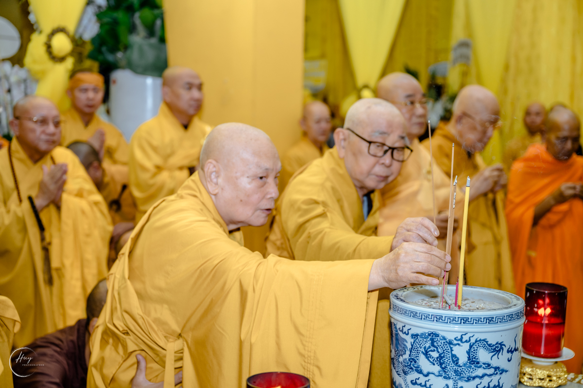 Tại Giác linh đường, chư tôn giáo phẩm HĐCM, HĐTS đã dâng hương lễ Phật, cử hành nghi thức cầu nguyện. Tiếng kinh linh thiêng của chư Tăng hòa cùng tâm thành kính tri ân sâu sắc, tạo nên năng lượng thanh tịnh, trang nghiêm, hồi hướng đến Giác linh cố Trưởng lão Hòa thượng cao đăng Phật quốc.