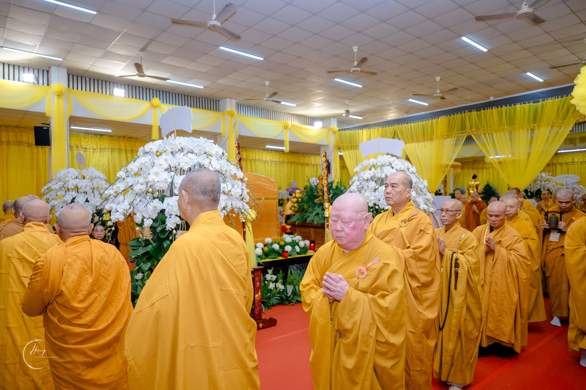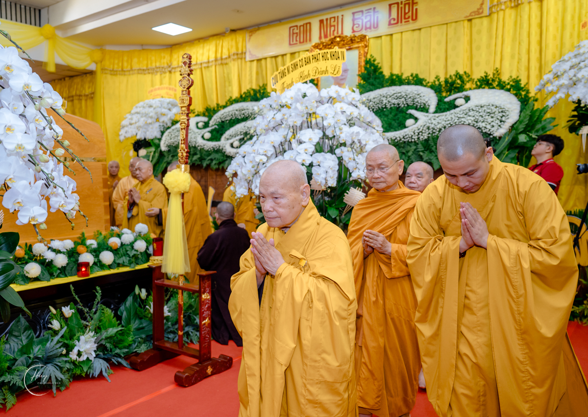 Tiếp đó, Trưởng lão Hòa thượng Chủ tịch cùng chư Tôn đức đã hữu nhiễu kim quan, nhất tâm tiễn biệt vị pháp hữu đã dành trọn cuộc đời cho sự nghiệp giáo dục Tăng Ni và hoằng dương chánh pháp.