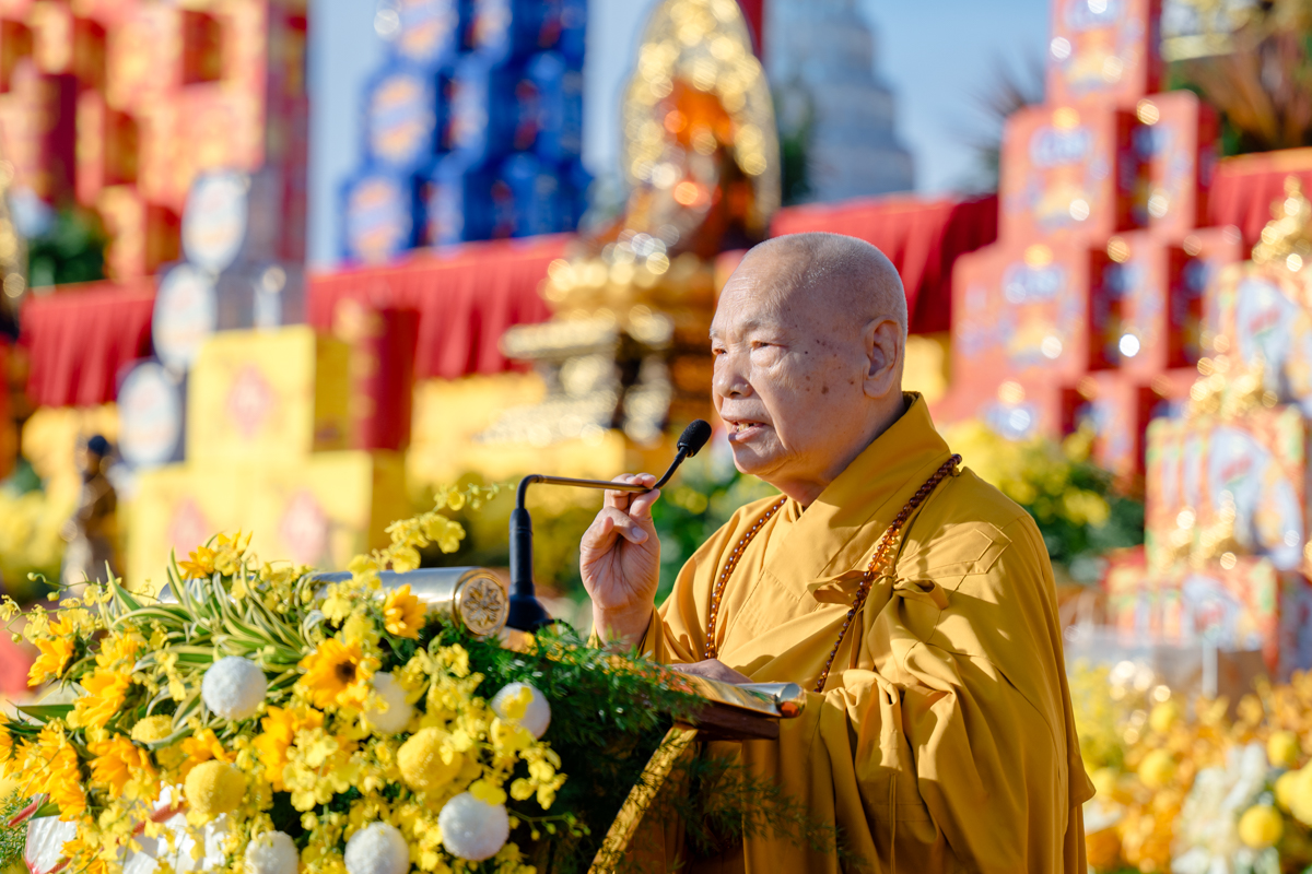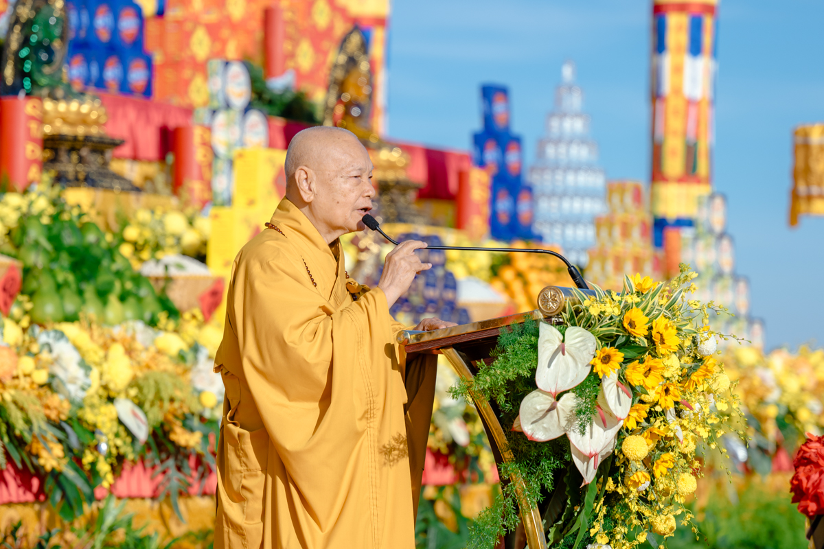 Trong đạo từ tại Đại lễ, Trưởng lão Hòa thượng Chủ tịch nhấn mạnh tinh thần cốt lõi của Phật giáo về mối quan hệ mật thiết giữa nội tâm con người và sự an hòa của xã hội. Trên nền tảng giáo lý Kinh Lăng Nghiêm và Kinh Hoa Nghiêm, Ngài chỉ rõ: khi tâm con người được an định thì thế giới tự nhiên và xã hội tất yếu sẽ đi đến an bình; tâm càng thanh tịnh thì đời sống cộng đồng càng bớt xung đột, khổ đau.