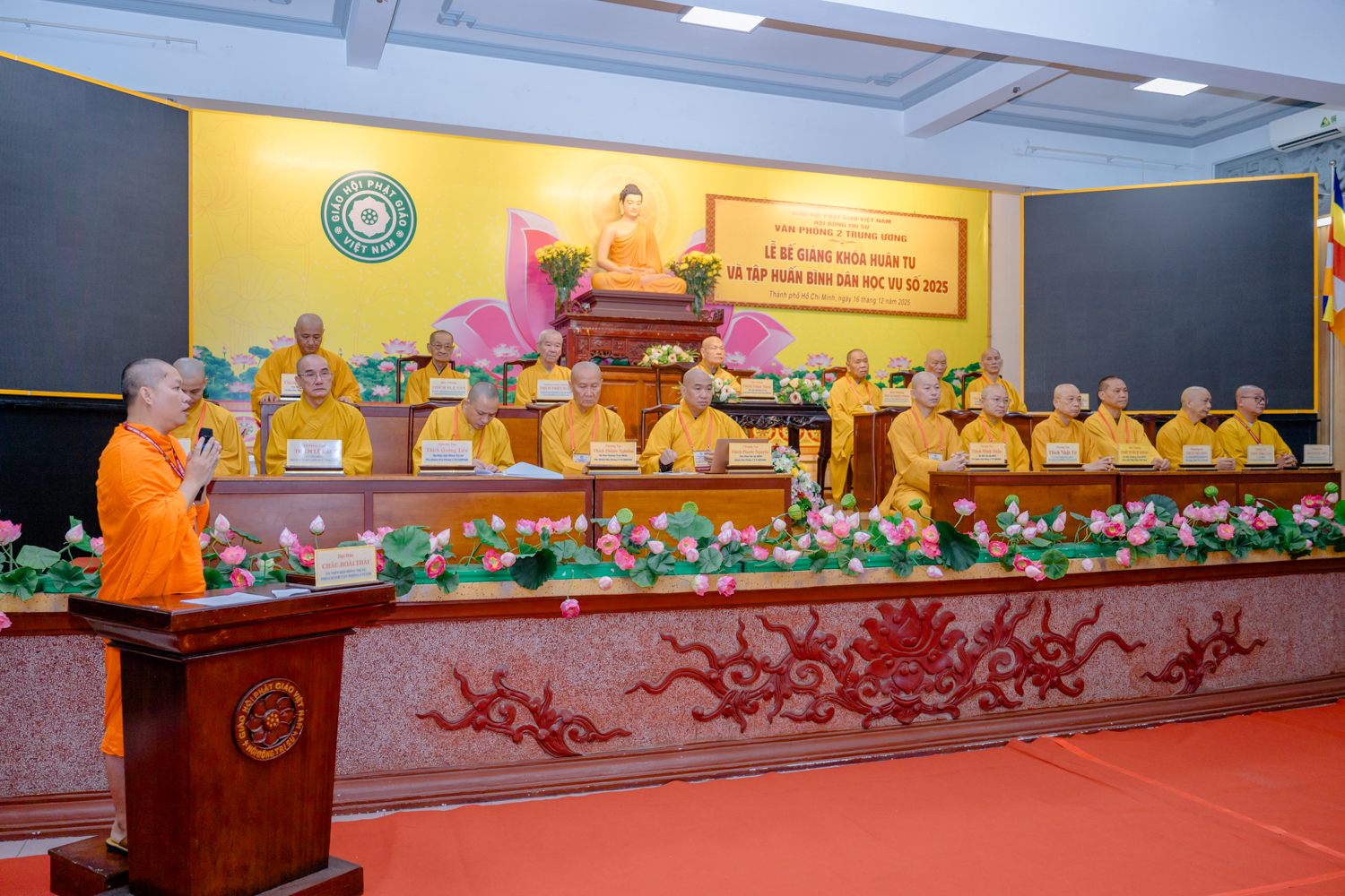 Tại buổi lễ, Thượng tọa Thích Phước Nguyên – Phó Tổng Thư ký kiêm Chánh Văn phòng 2 Trung ương, Trưởng Ban Tổ chức đã trình bày báo cáo tổng kết Khóa huân tu và tập huấn Bình dân học vụ số năm 2025. Theo báo cáo, khóa huân tu được tổ chức theo sự chỉ đạo của Trung ương Giáo hội, nhằm bồi dưỡng toàn diện về Tu – Học – Hành, kết hợp giữa hành trì thiền môn nghiêm mật và nâng cao nghiệp vụ hành chánh Giáo hội trong bối cảnh chuyển đổi số.