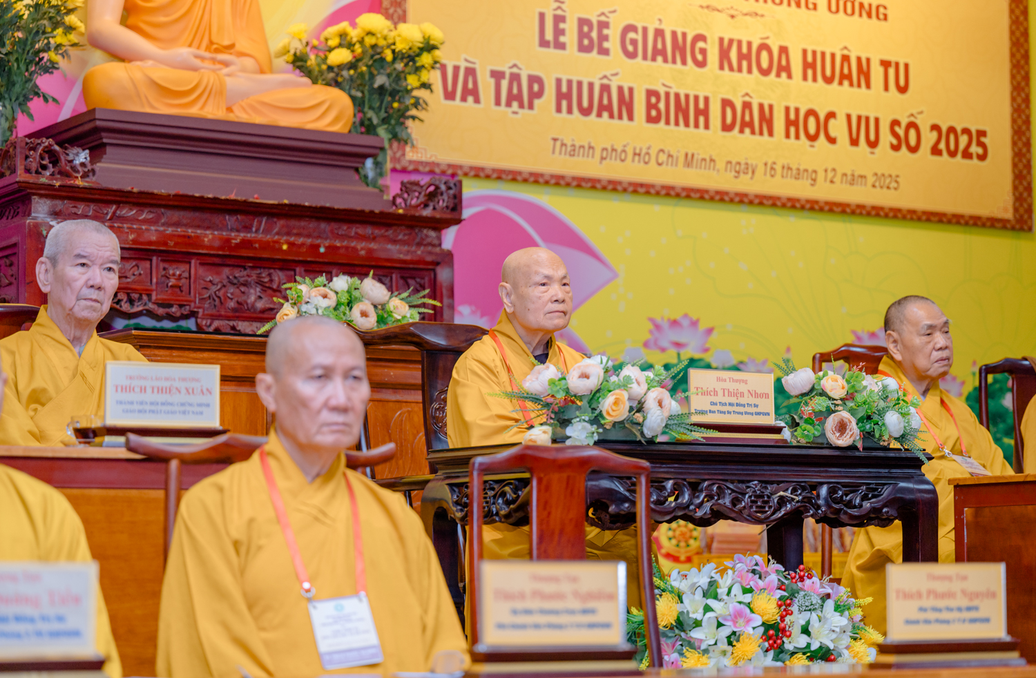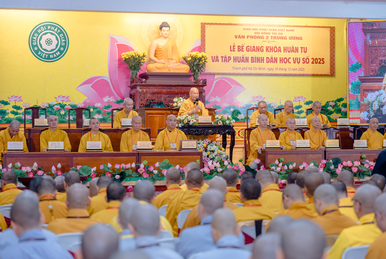 Đạo từ tại buổi lễ, Trưởng lão Hòa thượng Chủ tịch đã tán thán công đức Ban Tổ chức, Ban Giảng huấn và toàn thể chư Tăng Ni học viên đã nỗ lực tu học, góp phần làm nên thành công của Khóa huân tu và tập huấn Bình dân học vụ số năm 2025. Trưởng lão Hòa thượng nhấn mạnh ý nghĩa thiết thực của khóa huân tu trong việc xây dựng đội ngũ kế thừa có đạo hạnh vững vàng, tác phong kỷ cương và năng lực hành chánh phù hợp với xu hướng phát triển của thời đại.