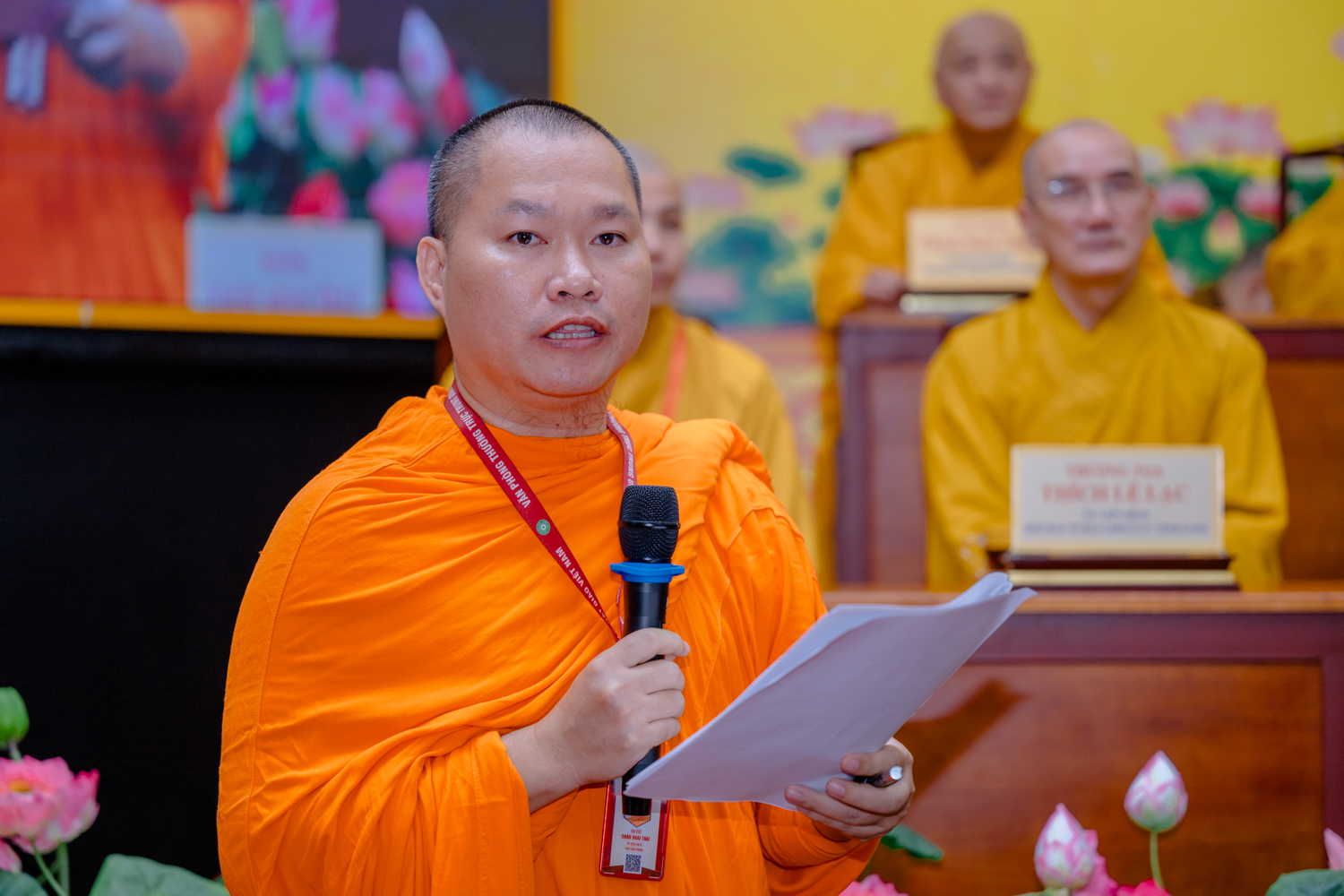 Phát biểu cảm tạ, Thượng tọa Thích Quảng Tiến – Ủy viên Hội đồng Trị sự, Phó Chánh Văn phòng 2 Trung ương thay mặt Ban Tổ chức thành kính tri ân chư tôn giáo phẩm Hội đồng Chứng minh, Hội đồng Trị sự; cảm ơn chư Tôn đức Ban Giảng huấn, chư Tăng Ni học viên cùng quý đơn vị, cá nhân phát tâm hộ trì đã góp phần làm nên thành quả viên mãn của Khóa huân tu và tập huấn Bình dân học vụ số năm 2025.